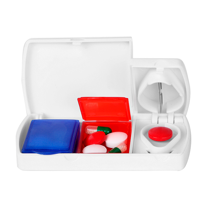 Pastillero de plastico con 2 compartimentos y cortador de pastillas. Medidas: 4.6×9.3 cm. Area de impresión: 3.5×5 cm. Colores: Blanco Impresión recomendada: Serigrafía.