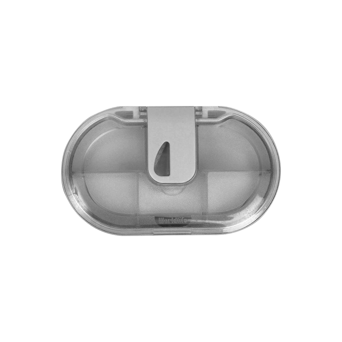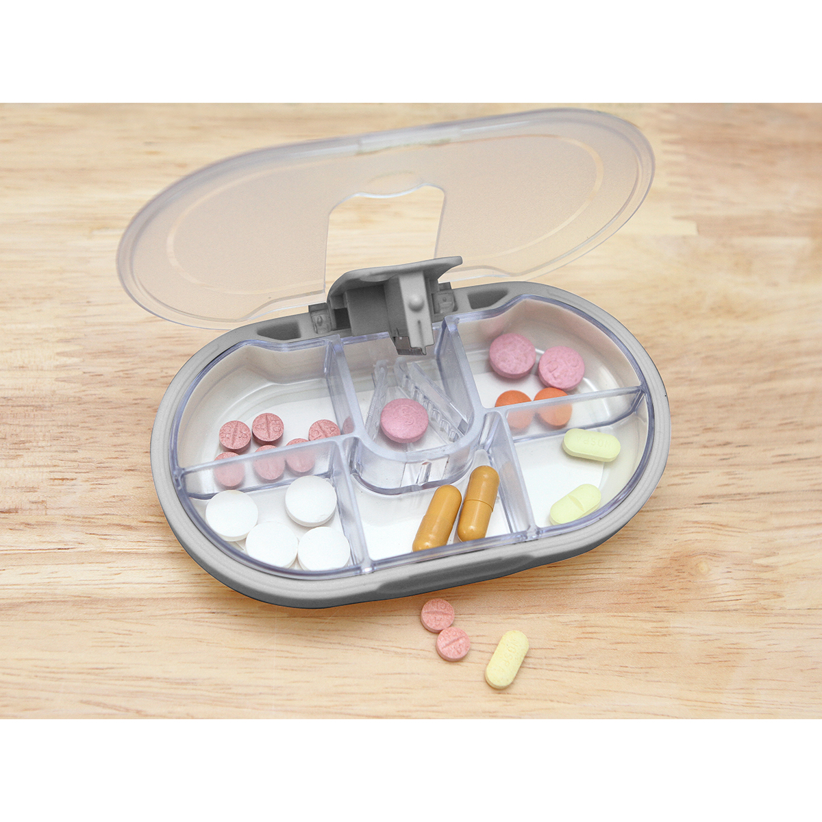 Pastillero con forma ovalada, fabricado en plástico AS (acrolonitrilo estireno), con cortador de acero inoxidable y 5 compartimentos.