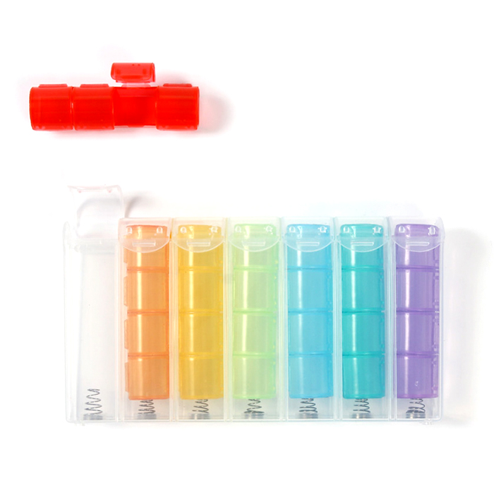 Pastillero con 7 compartimentos para dosis diarias, fabricado en plástico PP (polipropileno).