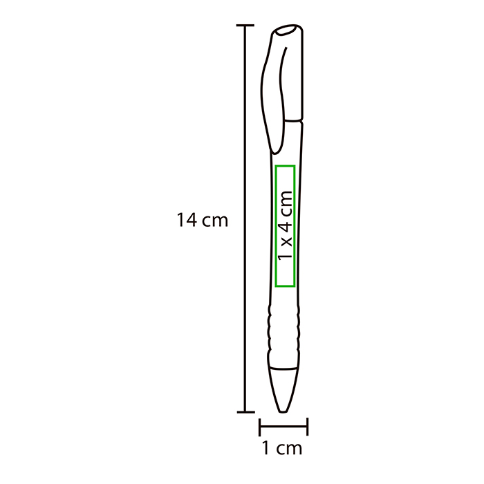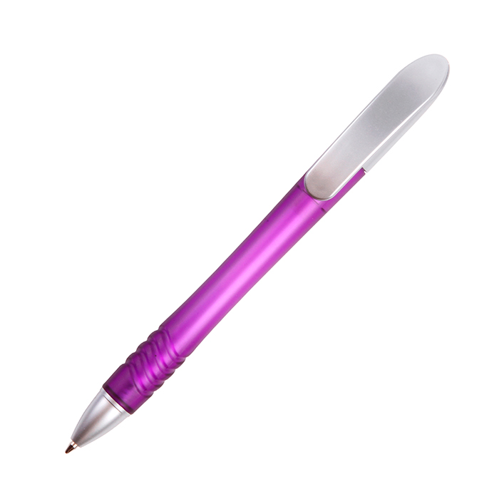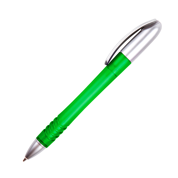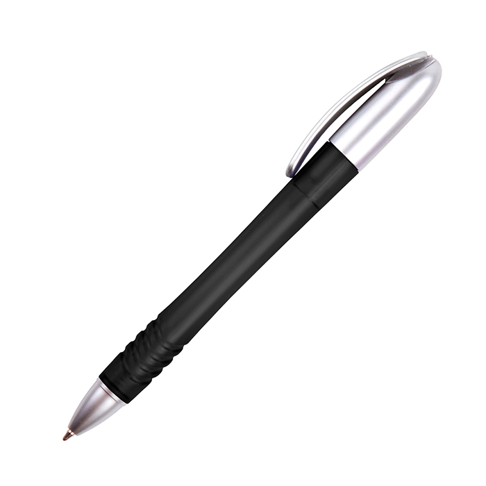 Bolígrafo de plástico con accesorios color plata y tinta negra.