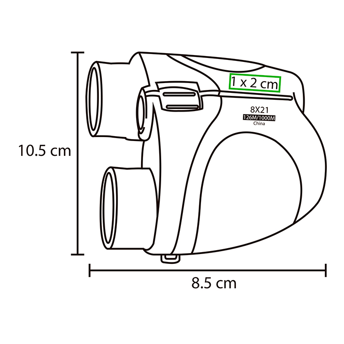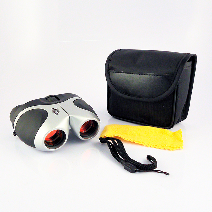 Binoculares deportivos con cristal anti-reflejante, paño limpiador, cordón y estuche.