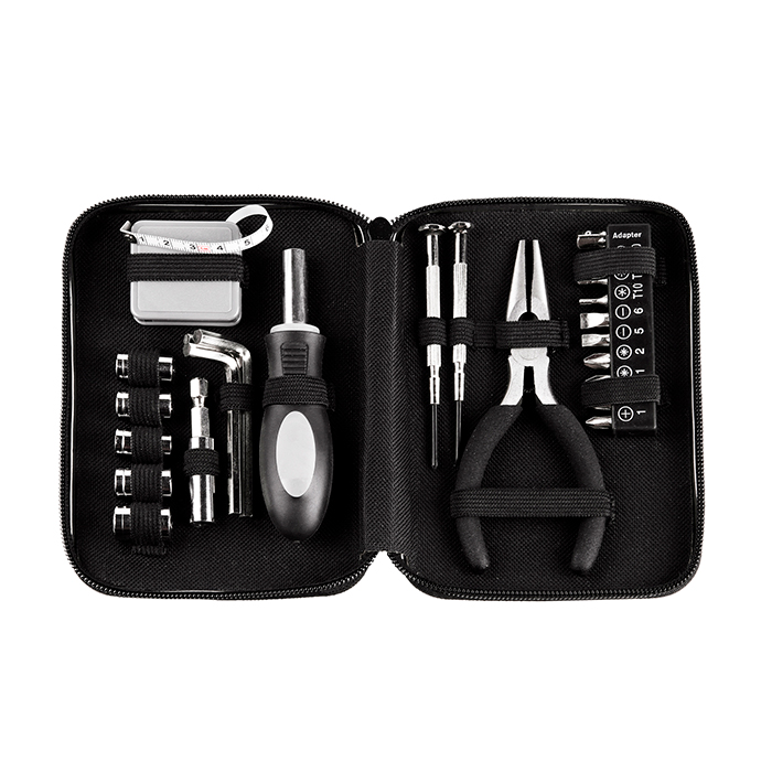 Estuche metálico de herramientas con 24 piezas. Medidas: 11×16 cm. Area de impresión: 9×14 cm. Colores: Plata Impresión recomendada: Grabado láser o serigrafía.