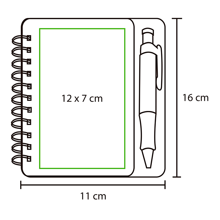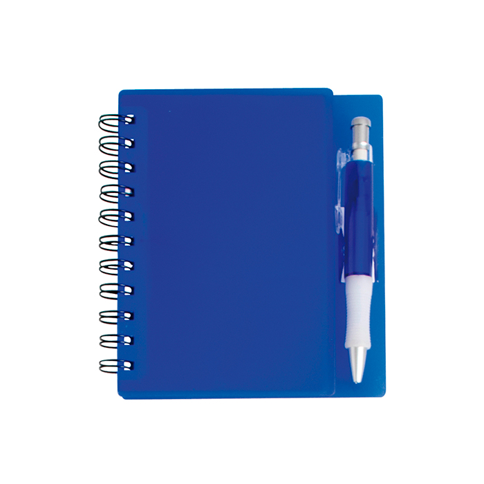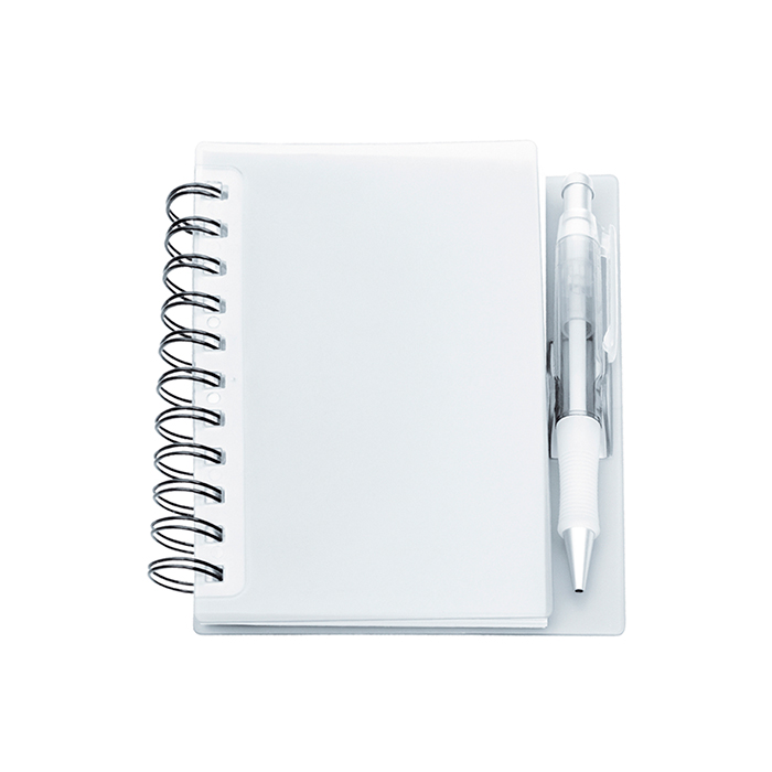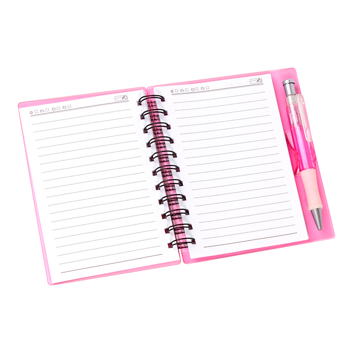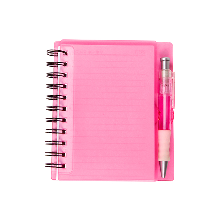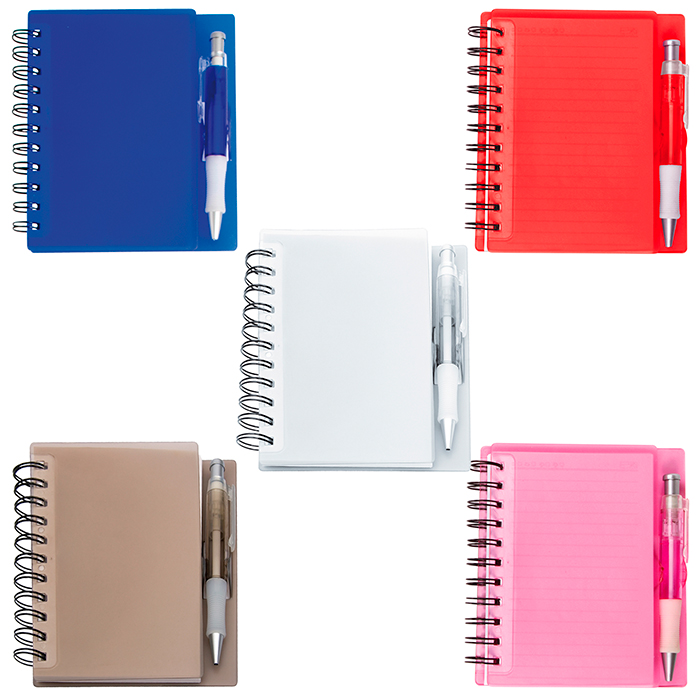 Libreta de notas fabricada en plástico, con 96 hojas de raya, pluma tinta negra y wire-o.
