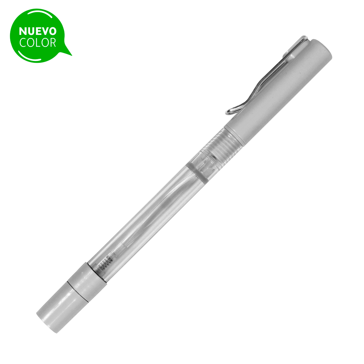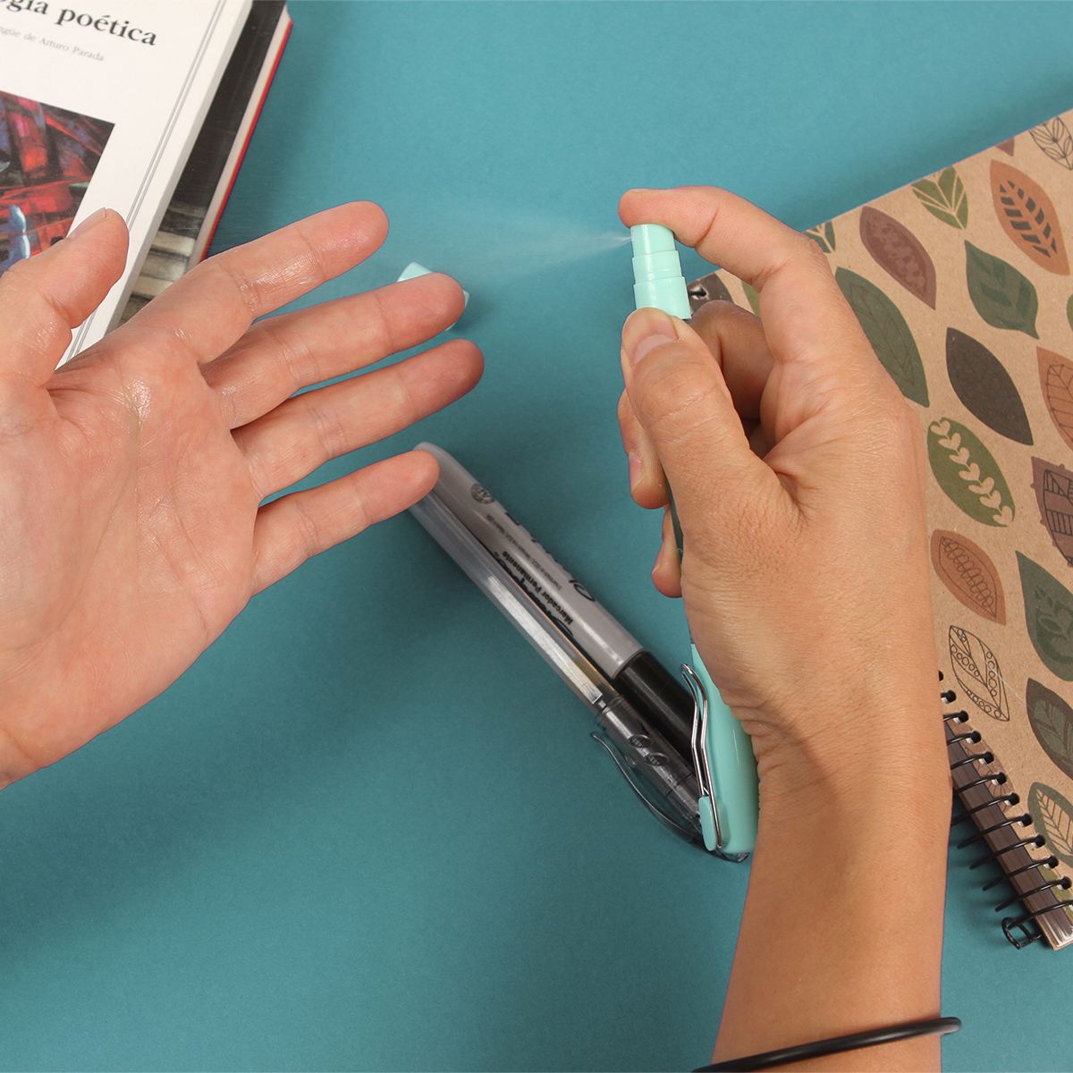 Bolígrafo anti bacterial fabricada en plástico ABS con atomizador y contenedor de 4 ml., para liquido desinfectante, con clip de metal y tinta de gel color negro.