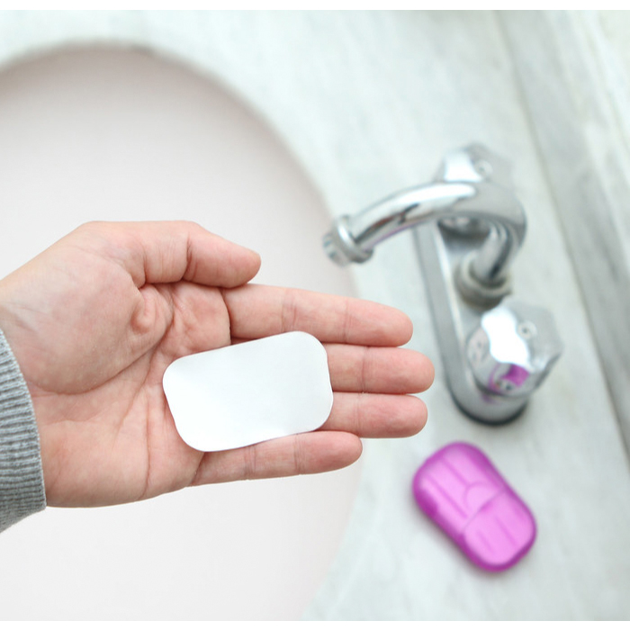 Contenedor portátil fabricado en PP (Polipropileno), con 20 láminas de jabón.