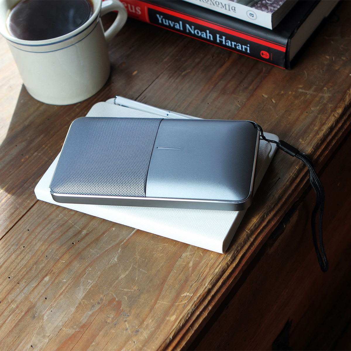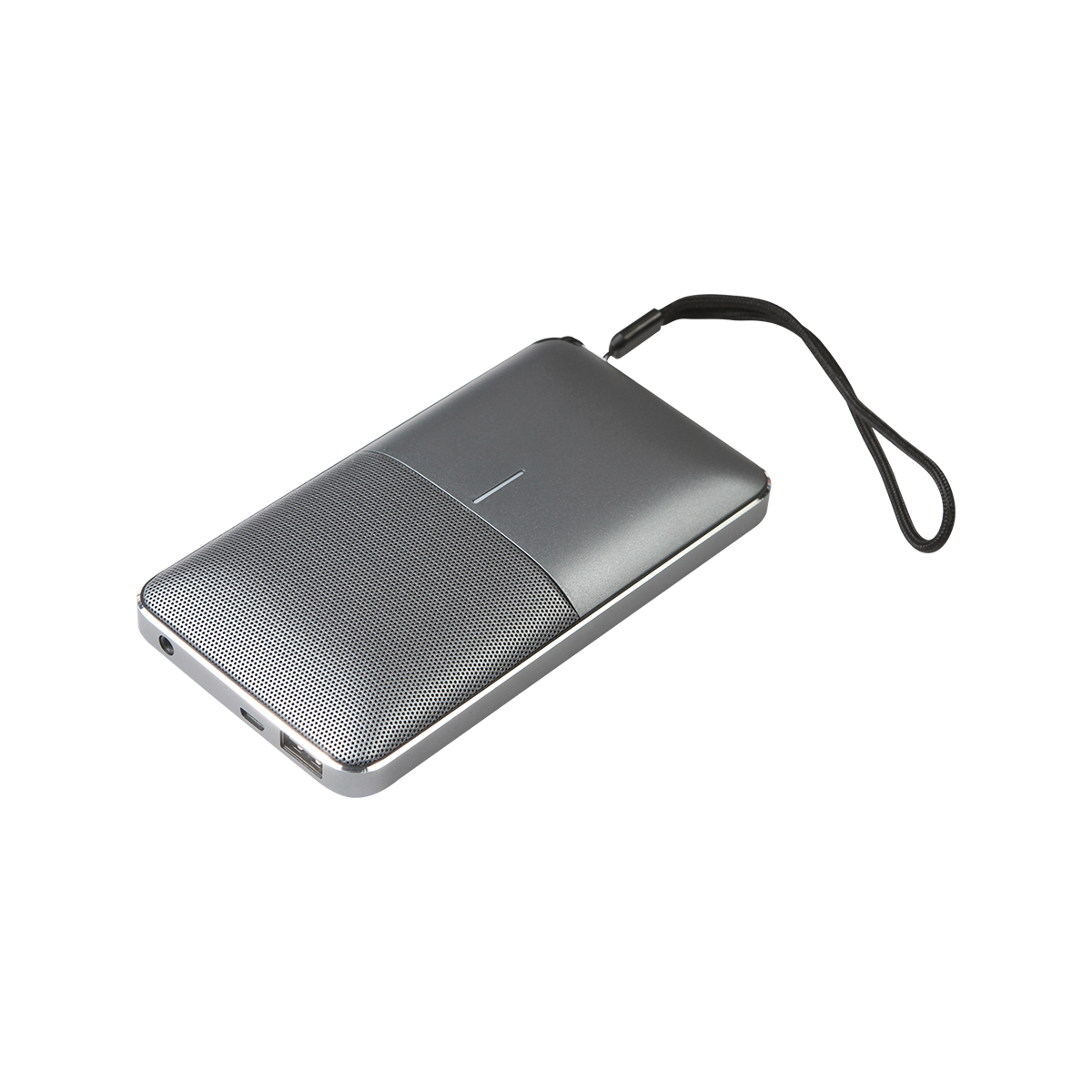 Bocina bluetooth fabricada en metal con radio FM, entrada auxiliar, USB y función de power bank capacidad de 6,000 mAh.