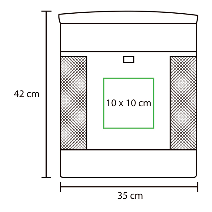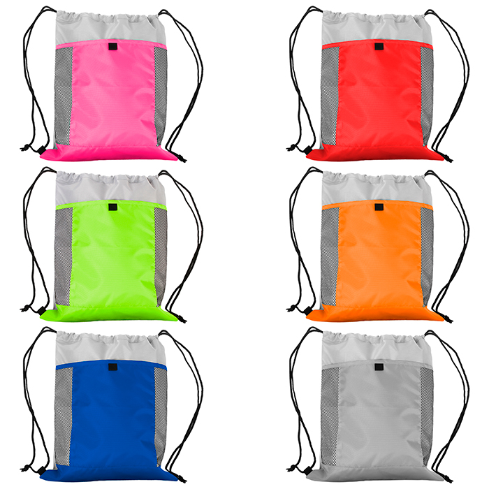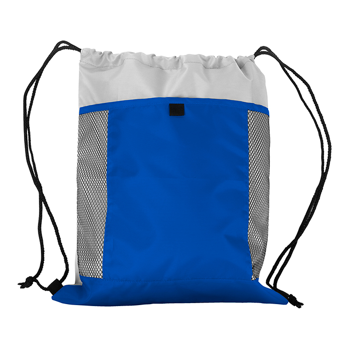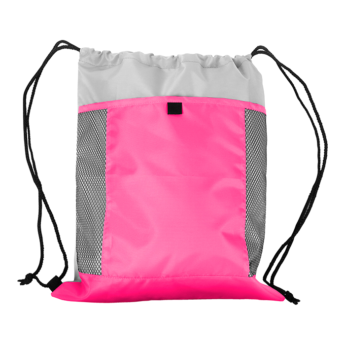 Morral tipo saco fabricado en poliéster con jaretas y bolsa en frente.