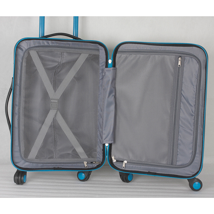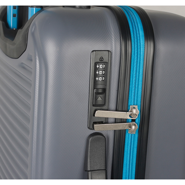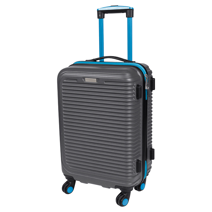Maleta rígida de viaje tipo carry on con ruedas, color gris con cierre en diferentes colores, mango retráctil y chapa de seguridad, doble compartimento interior con cierre y tensor para ropa.